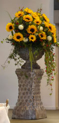 Ruth Kälin hat mit ihren wünderschönen Sonnenblumen - Gestecken die Kirche und den Brunnen zusätzlich erstrahlen lassen.