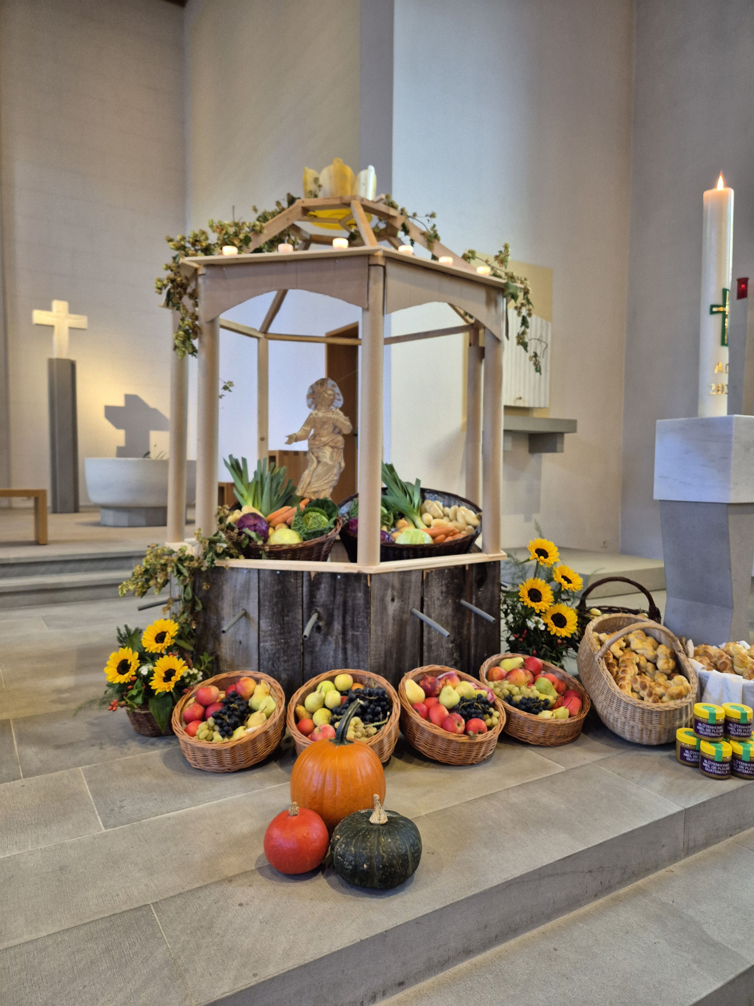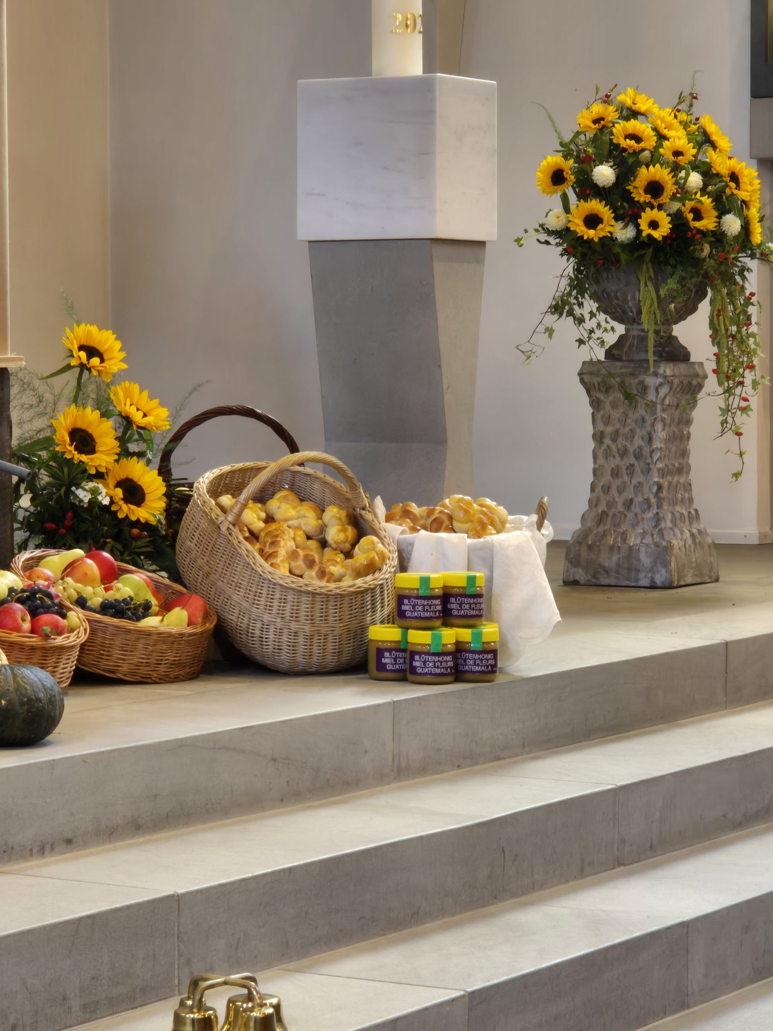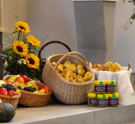 Täglich gibt es tausend Gelegenheiten, sich zu freuen und dankbar zu sein. Zum Beispiel über den warmen Sonnenschein und die frohe Gemeinschaft an diesem Morgen. Beides hat auch übers Jahr viel dazu beigetragen, dass sich den Gottesdienstbesuchern im Altarraum der Kirche ein so farbenfrohes Bild bot. Lisbeth Kälin und ihre Helfer hatten am Vorabend die Körbe mit den Früchten und dem Gemüse schön arrangiert, und herrliche Blumengestecke in den Farben des Spätsommers zogen die Blicke auf sich. Vor einem kleinen Weizenfeld standen Körbe mit fein duftenden Zöpfli.