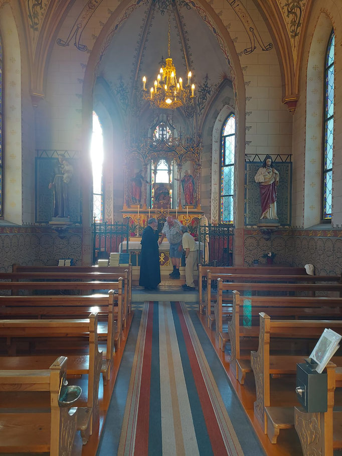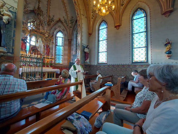 Im Anschluss an die Messe gab Priorin Annemarie Holdener einen kurzen geschichtlichen Überblick über das Kloster und erzählte aus dem Leben der Klostergemeinschaft: Die heutige Kirche, mit ihren modernen Bildern, welche den Zyklus der Welt darstellen, wurde 1974 eingeweiht. Erstmals schriftlich erwähnt wurden die Waldschwestern 1277. Vom Katzenstrick bis zur Au standen vier selbständige Häuser, alle beseelt mit Waldschwestern, welche selbständige Gemeinschaften bildeten. Erst im Laufe der Zeit, schlossen sie sich aus wirtschaftlichen Gründen zusammen. Man lebte von dem, was einem die Natur bot: Beeren, Pilze, Wurzeln. Seit 1617, in Anlehnung ans Kloster Einsiedeln, sind die Schwestern Benediktinerinnen. Nach dem zweiten Weltkrieg lebten noch gut fünfzig Schwestern in der Au, heute sind es deren zwölf, die Älteste 93-, die Jüngste 60 jährig. Der Tag beginnt morgens um sechs und endet bald nach zwanzig Uhr. Vier Stunden verbringen die Schwestern beim gemeinsamen Gebet und da sie die anfallenden Arbeiten nicht mehr alle selbst bewältigen, sind drei weltliche Personen angestellt, sowie eine grössere Zahl für die Anbetungsstunden. Die Priorin freute sich ausserordentlich über die zahlreichen Gäste an dieser Wallfahrt, war doch die Kirche zum Bersten voll, sogar die reservierten Bänke der Schwestern waren voll bepackt mit Wallfahrern.