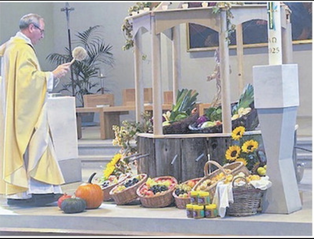 Anstelle einer herkömmlichen Predigt versuchten Pater Basil und Monika Tschümperlin die Gedanken des Erntedankes etwas zu zerlegen und den Kirchgängern zugänglich zu machen. Am heutigen Sonntag gelte der Dank nicht nur für die uns reich geschenkten Gaben, sondern auch den vielen Menschen, die wie auch immer dazu beitragen würden, dass wir uns immer an einen reich gedeckten Tisch setzen könnten. So hätten alle auch eine Verantwortung für Gottes Schöpfung. Eine reiche Ernte ohne Räder, von denen zwei im Chorraum platziert waren, sei kaum denkbar. Die Speichen dieser Räder würden Stabilität bedeuten, um aus dem Boden mehr zu erzeugen. Der die Räder umspannende Eisenring würde alles zusammenhalten. So sollen wir uns doch fragen, was uns als Gemeinschaft zusammenhält? Dann sei auch Wasser ein wichtiger Rohstoff, mit dem sorgfältig umzugehen sei. Die Sonnenblume symbolisiere Energie und Gott wolle unserem Leben diese Energie geben. Die Waage bedeute, dass wir zuerst zwar nehmende aber auch gebende seien und der Maiskolben gehöre zum Bild unserer Landschaft. Der daraus entstehende Sauerstoff ergäbe ein Klima, wo wir gerne leben würden. Wenn wir uns dies alles bewusst seien, könne etwas Gutes entstehen. Auch in den Fürbitten gedachte man nochmals der Früchte dieser Erde und bat um Kraft, diese Erde zu lieben und Verantwortung für die Schöpfung zu übernehmen. Nach der Gabenbereitung segnete Pater Basil die wunderbar hergerichteten Früchte, Lebensmittel und Gemüse und dankte für die Kraft der Sonne, die all dies reifen liess. Zum Friedensgruss erwähnte er, dass Gott uns die Welt in unsere Hände lege, damit wir für sie mit der entsprechenden Verantwortung sorgen würden. Während des Agnus Dei sang der Chor wunderbare Gesänge und vor Ende des Gottesdienstes sangen fünf junge Frauen aus dem Chor das sehr hörenswerte Lied von John Rutter: «For the beauty oft he earth».